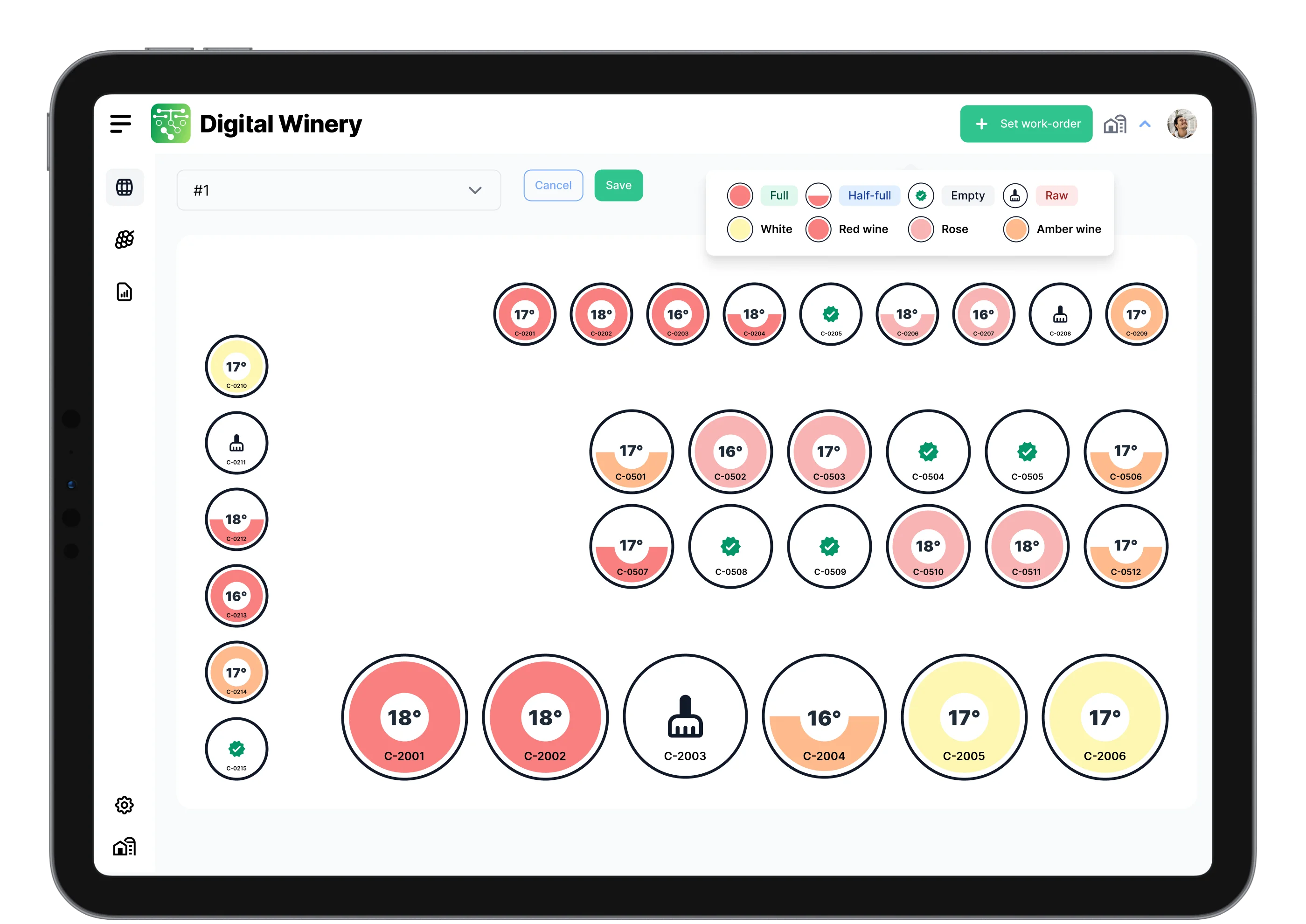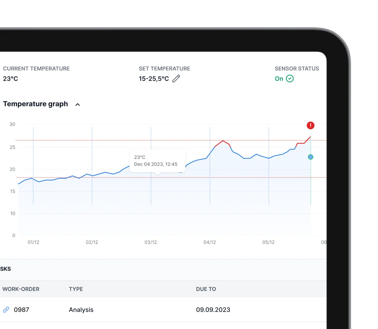 The temperature graph shows precise or aggregated data from the sensors installed on each tank. The work order system and operation statuses allow trouble-free processes monitoring.